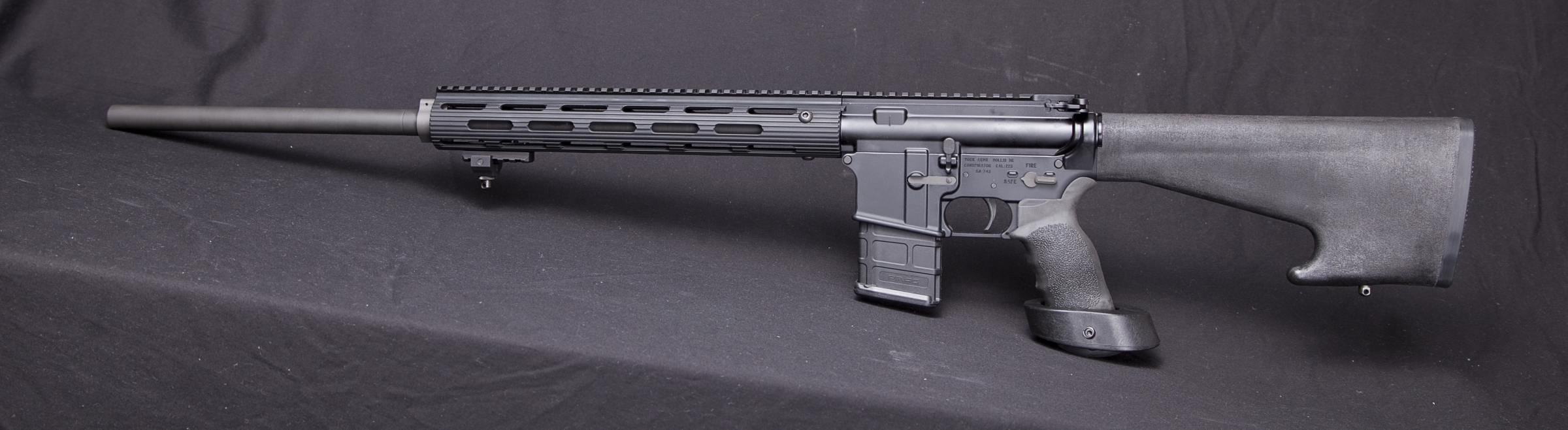 Custom receiver, custom handguard. All of the aluminum parts are andoized in 'sand'. The barrel is a custom chambering, ultra heavy profile in carbon fiber and mated with a 51T silencer mount.