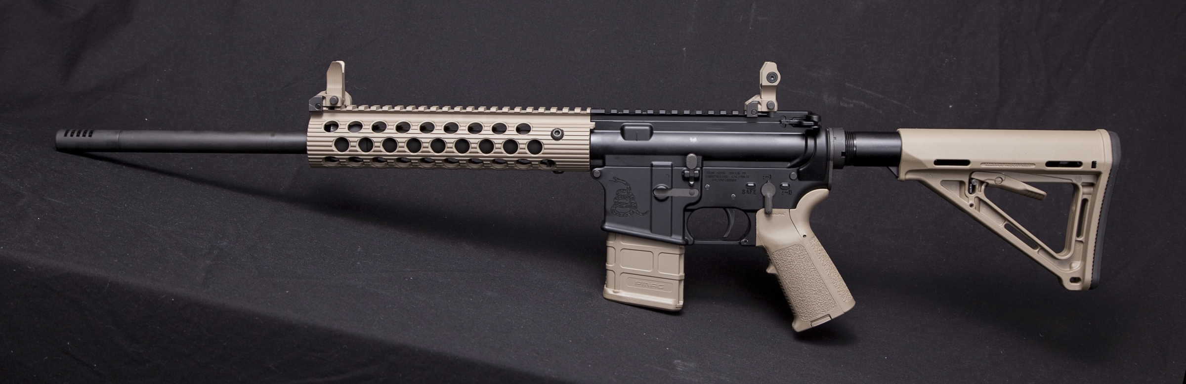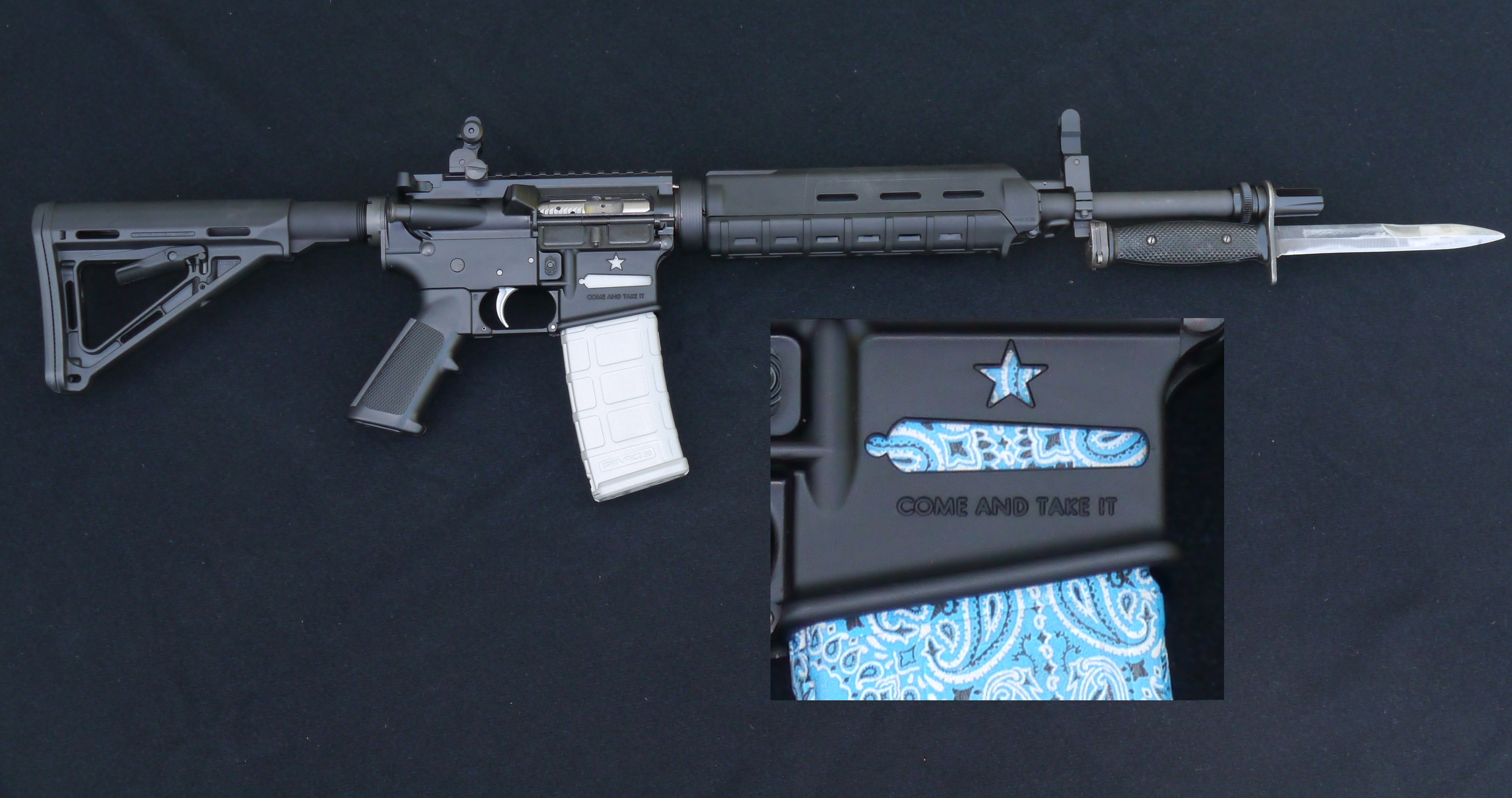 Custom receiver, through-magwell engraving, lightweight 223 Wylde barrel with midlength gas, bayonet and 51T silencer mount.