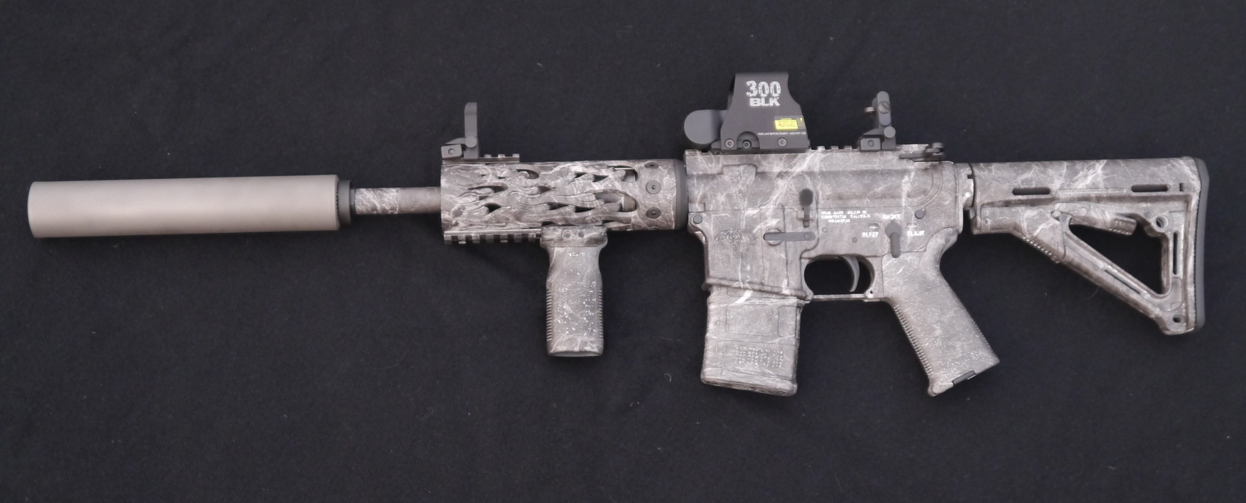 Custom receiver, 10" .300 Blackout, custom Flame-styled milled handguard, two-stage trigger, Titanium silencer, hydroprinted charcoal marble finish.