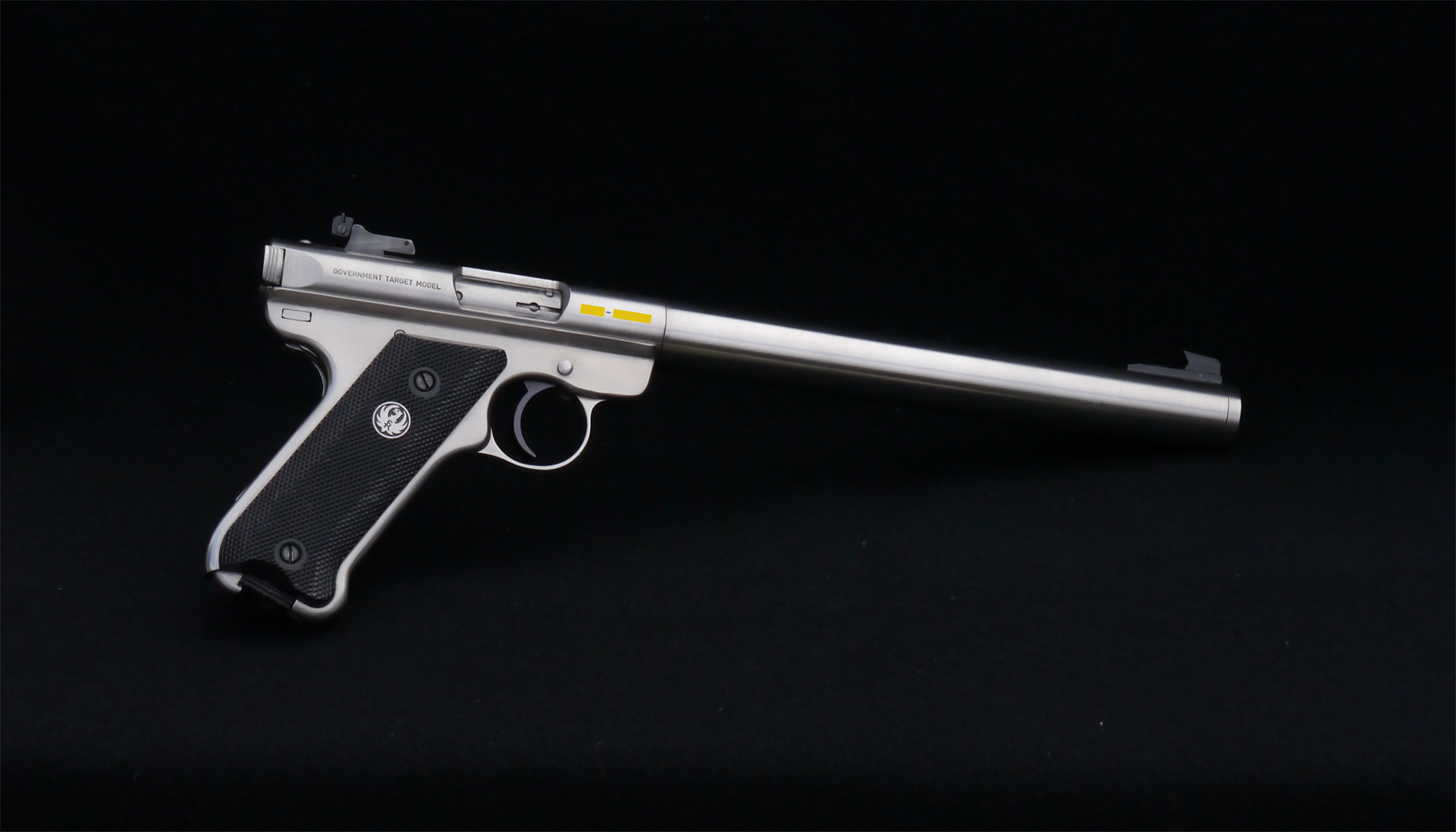 Ruger Mk2 Gov't Target fitted with an intgral silencer.
