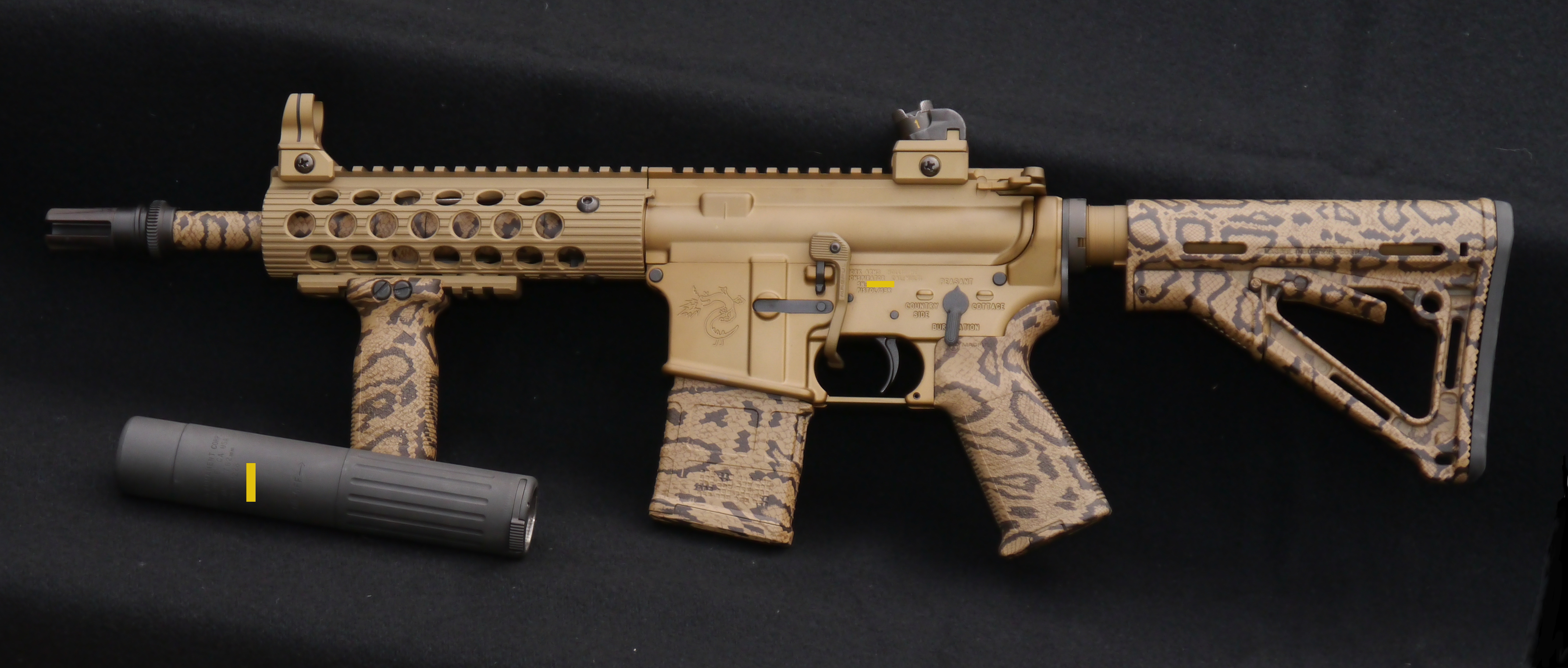 300BLK Short barreled rifle and silencer. The aluminum is finished in a 'sand' colored hard anodize. Hydroprinted 'dragon skin' pattern to match.